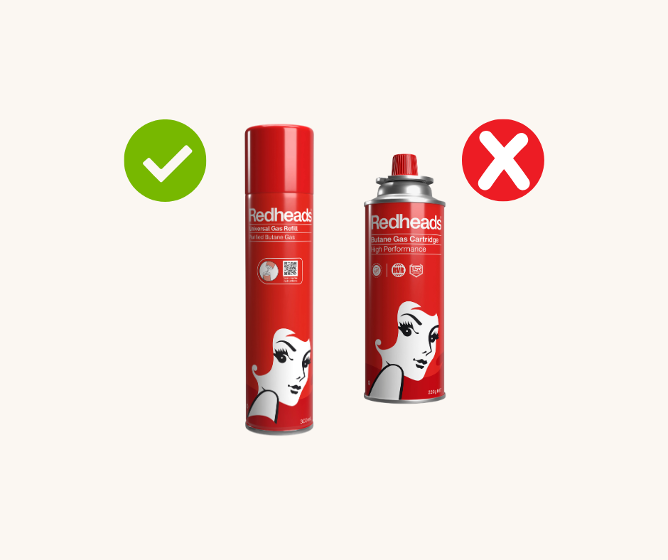 Always refill your Gasmatch upside-down to prevent air from entering. If air does enter, release it by pressing the refill inlet valve with a small screwdriver until no hissing sound is heard.